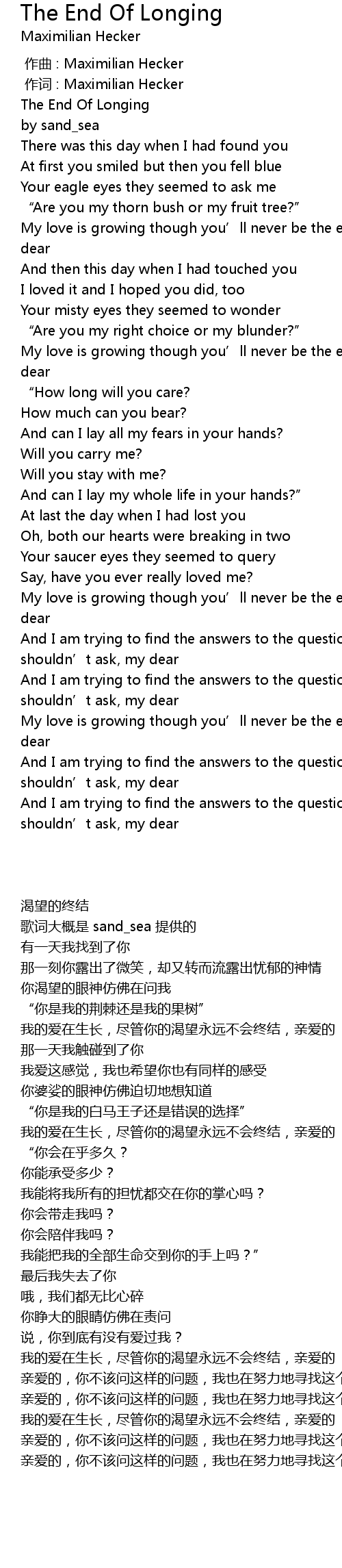 | [03:21.37] | My love is growing though you’ll never be the end of longing, my dear |
