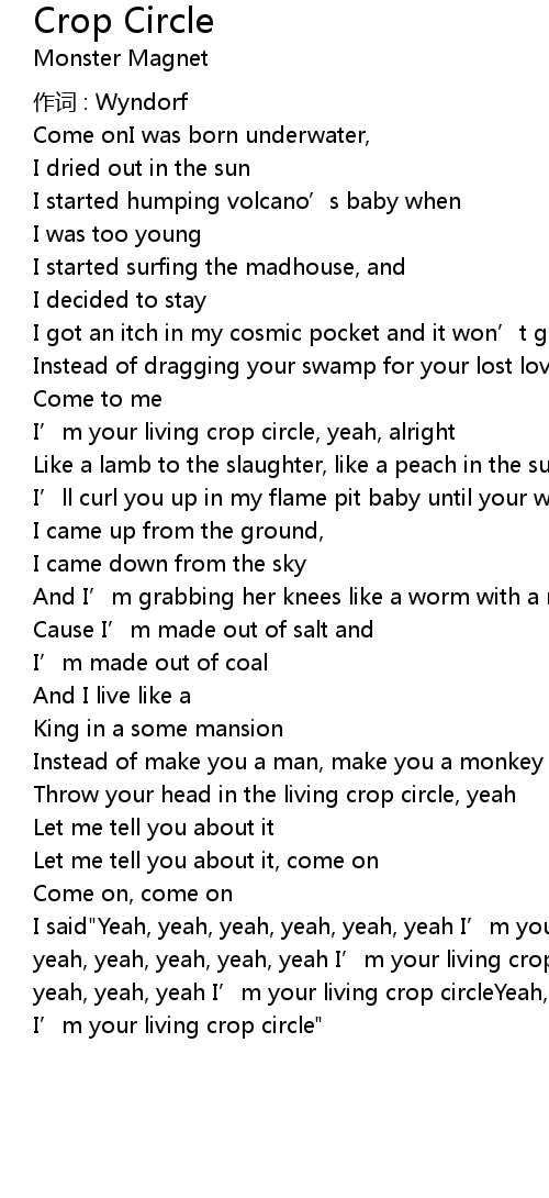 | I said"Yeah, yeah, yeah, yeah, yeah, yeah I’m your living crop circleYeah, yeah, yeah, yeah, yeah, yeah I’m your living crop circleYeah, yeah, yeah, yeah, yeah, yeah I’m your living crop circleYeah, yeah, yeah, yeah, yeah, yeah I’m your living crop circle" |