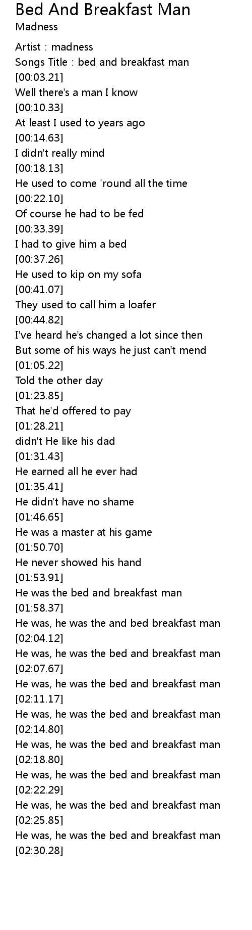 | [00:01.22] | Songs Title: bed and breakfast man |
