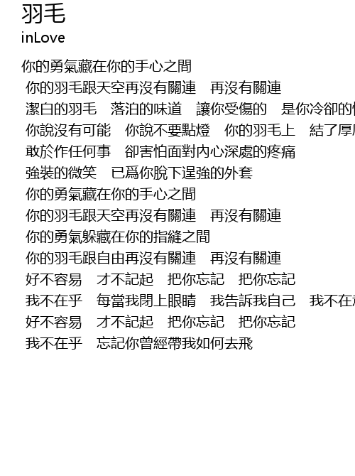 | 潔白的羽毛 落泊的味道 讓你受傷的 是你冷卻的懷抱 | |