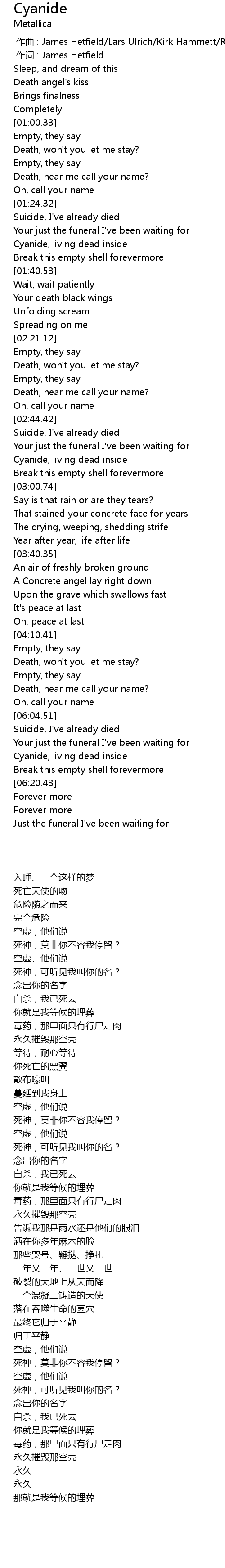 | [00:01.00] | 作词 : James Hetfield |