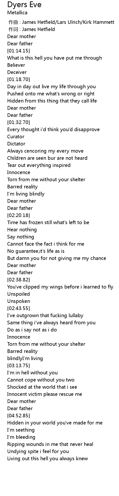 | [00:00.00] | 作曲 : James Hetfield/Lars Ulrich/Kirk Hammett |
