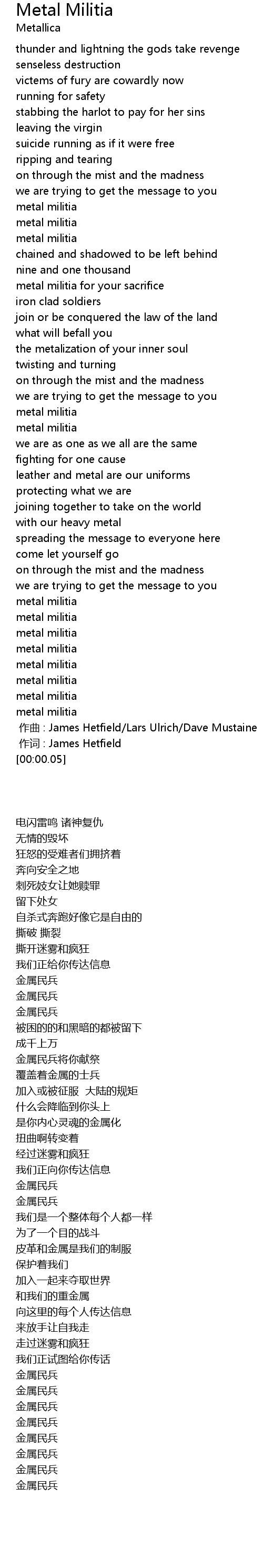 | [00:00.00] | 作曲 : James Hetfield/Lars Ulrich/Dave Mustaine |