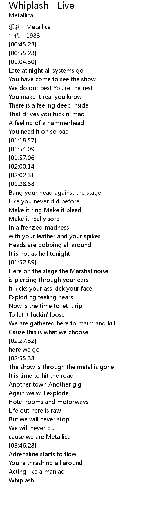 | [03:19.80][02:02.31][01:27.72] | Whiplash |