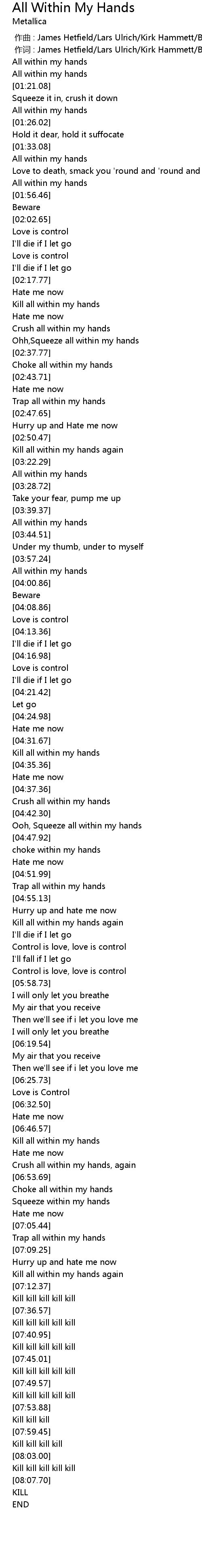 | [00:01.00] | 作词 : James Hetfield/Lars Ulrich/Kirk Hammett/Bob Rock |