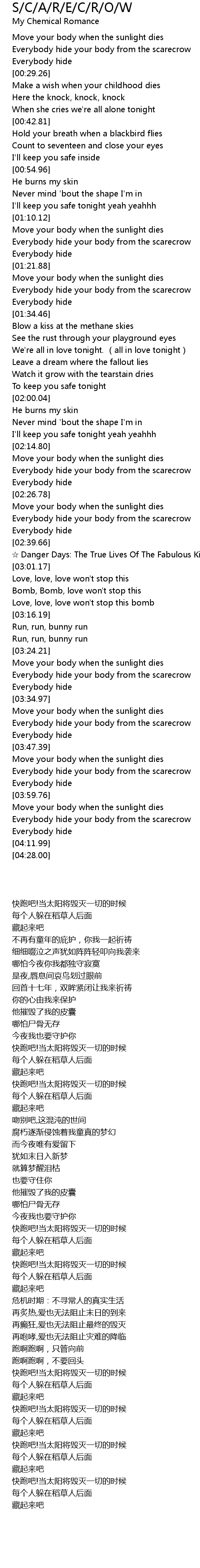 | [02:19.78] | Everybody hide your body from the scarecrow |