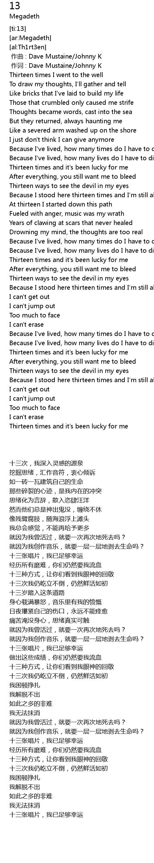 | [00:01.00] | zuò cí : Dave Mustaine Johnny K |