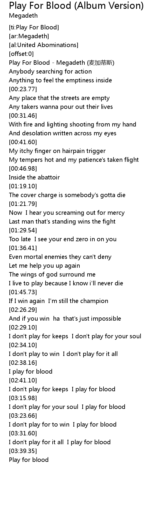| [03:19.22] | I don' t play for your soul I play for blood |