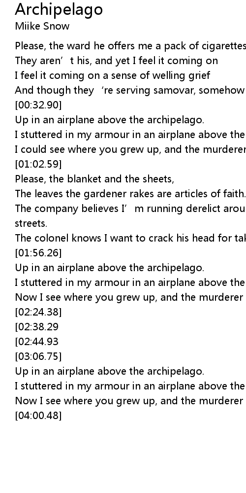 | [00:40.45] | I stuttered in my armour in an airplane above the archipelago. |