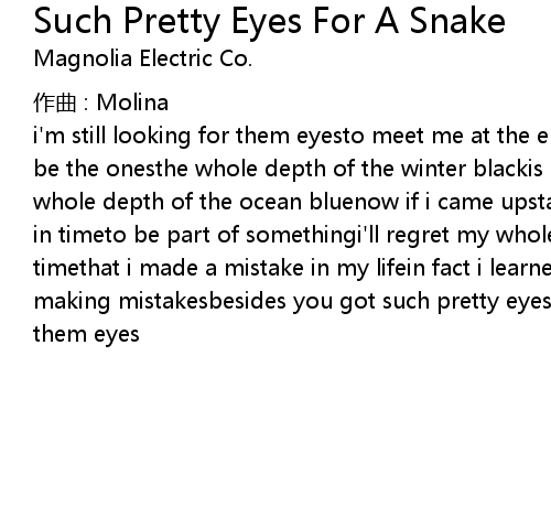 | i' m still looking for them eyesto meet me at the end of the lineis it going to be the onesthe whole depth of the winter blackis it going to be the onesthe whole depth of the ocean bluenow if i came upstairs with youi bet i' ll be just in timeto be part of somethingi' ll regret my whole lifeit wouldn' t be the first timethat i made a mistake in my lifein fact i learned howto make a livingout of making mistakesbesides you got such pretty eyesfor a snakei' m still looking for them eyes |