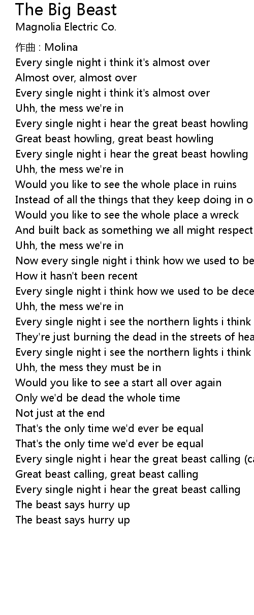| Every single night i hear the great beast calling call us | |