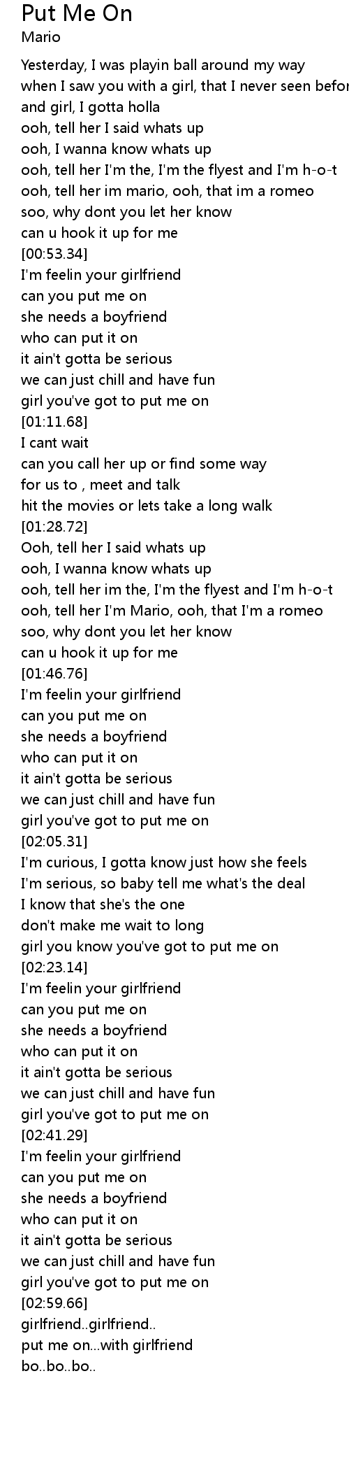 | [02:19.04] | girl you know you've got to put me on |