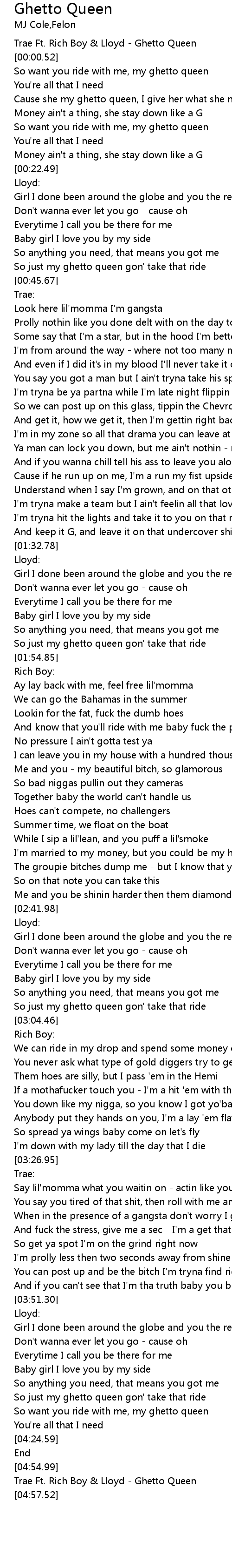 | [00:10.98] | Cause she my ghetto queen, I give her what she need |