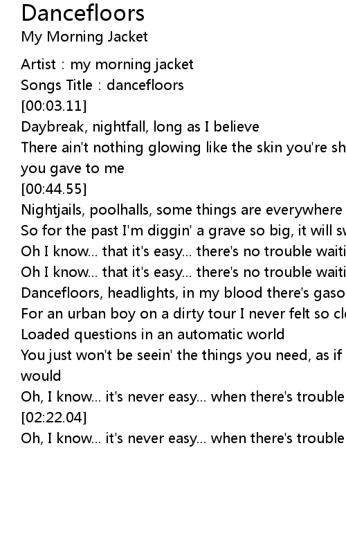 | [01:36.02] | Dancefloors, headlights, in my blood there' s gasoline |