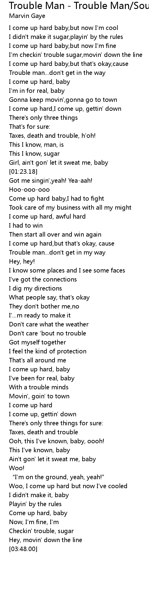 | [02:07.64] | Trouble man...don't get in my way |