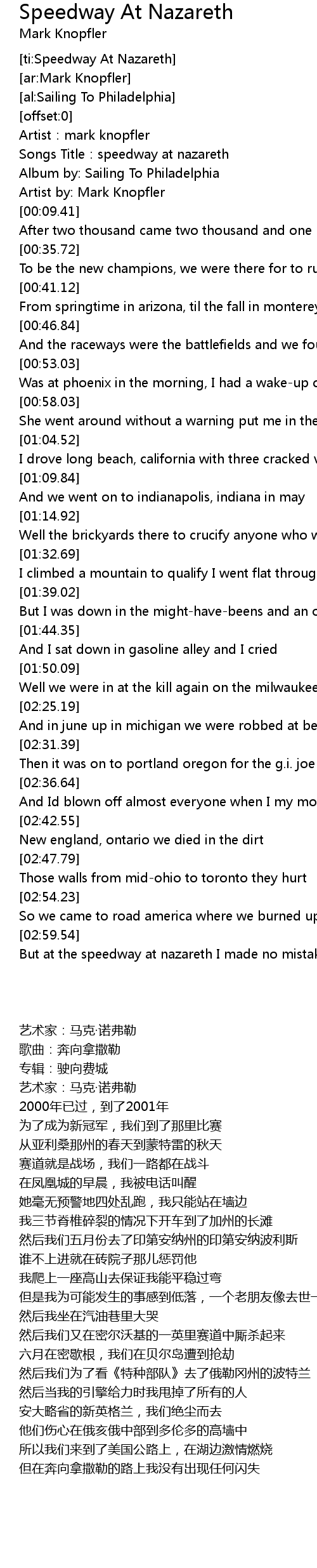 | [00:05.66] | Songs Title:speedway at nazareth |