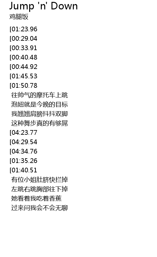 | [04:51.44][04:34.76][04:18.14][02:28.83][01:19.28] | nǐ lái Jump wǒ lái Down ó Jump |
