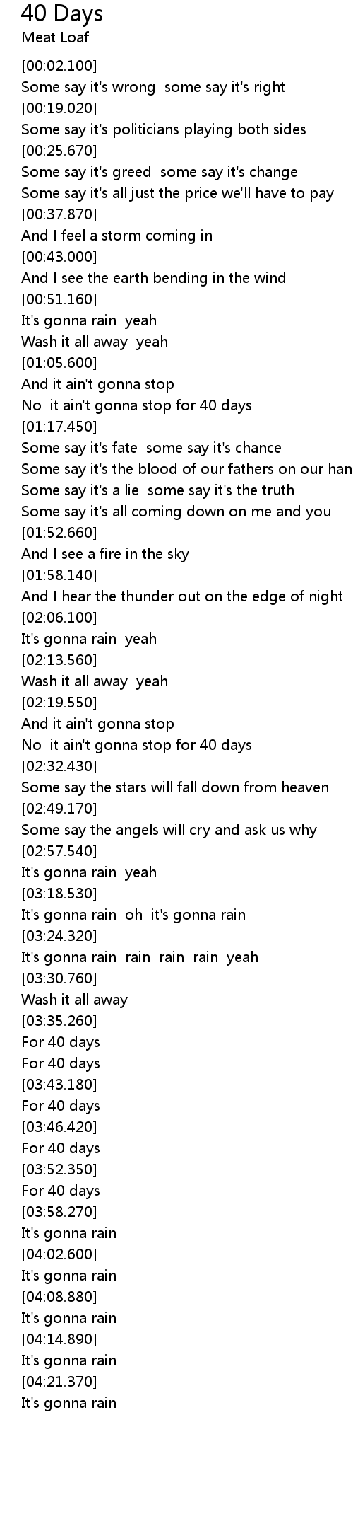 [02:23.950] No it ain't gonna stop for 40 days