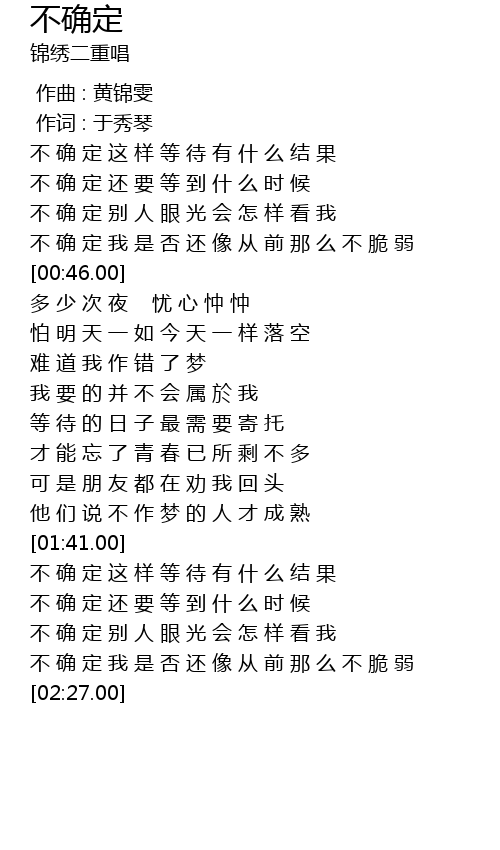 | [02:00.00] | 不 确 定 还 要 等 到 什 么 时 候 |