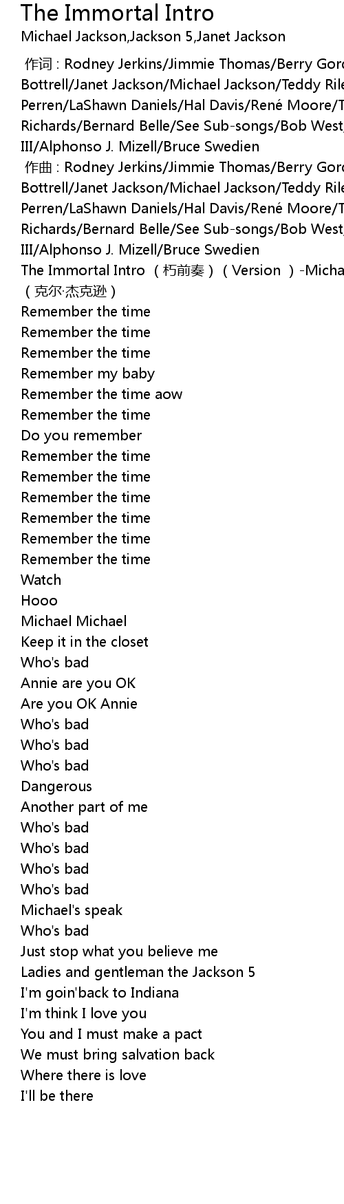| [00:00.000] | 作词 : Rodney Jerkins/Jimmie Thomas/Berry Gordy, Jr./Bill Bottrell/Janet Jackson/Michael Jackson/Teddy Riley/Willie Hutch/Freddie Perren/LaShawn Daniels/Hal Davis/René Moore/Terry Lewis/Nora Payne/Deke Richards/Bernard Belle/See Sub-songs/Bob West/Fred Jerkins/James Samuel Harris III/Alphonso J. Mizell/Bruce Swedien |