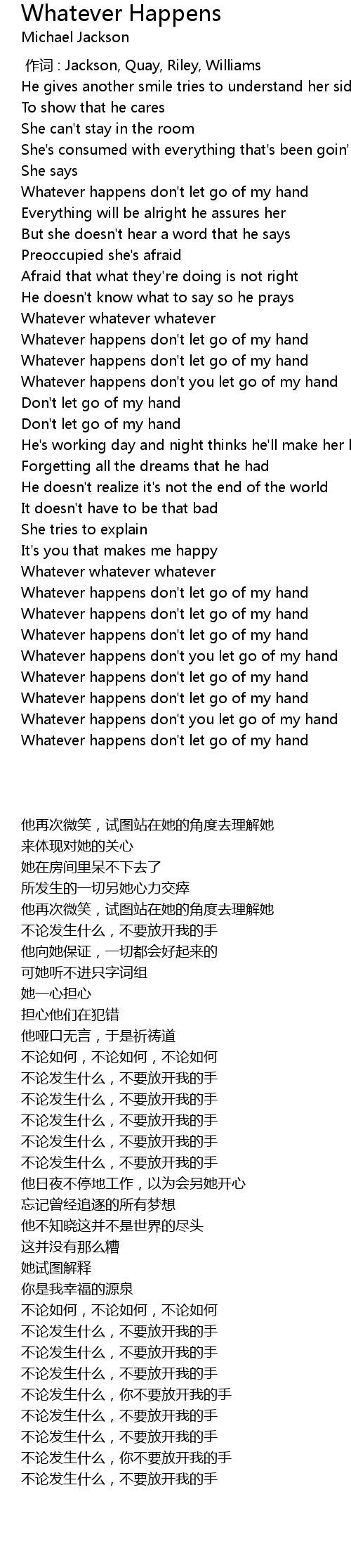 | [03:04.150] | Whatever happens don' t you let go of my hand |