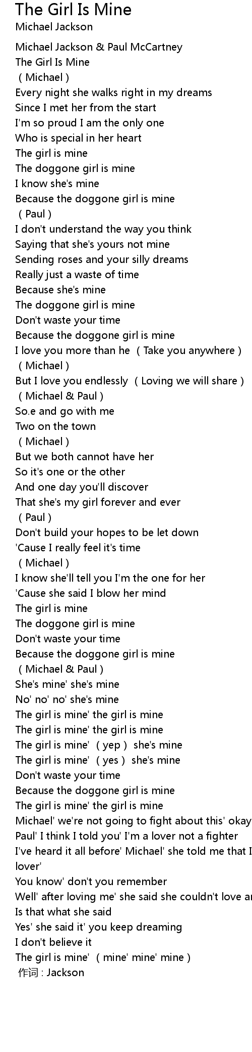 | [03:22] | The girl is mine' (mine' mine' mine) |