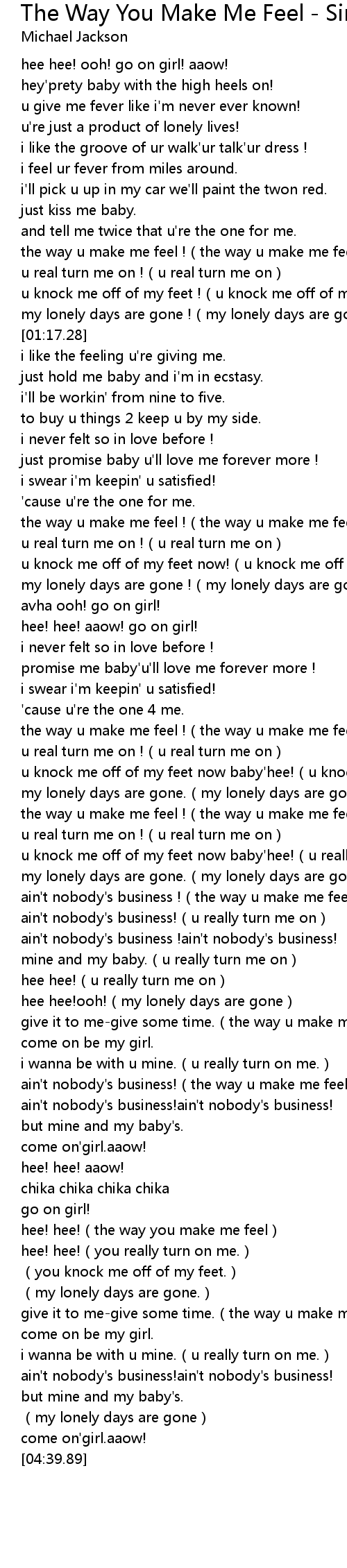 | [01:00.20] | the way u make me feel !(the way u make me feel) |