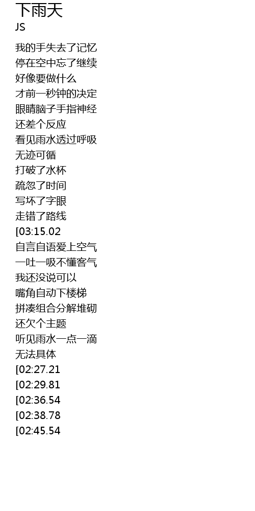 | [03:41.99][03:15.02][02:47.86][02:20.69][01:26.04] | 讨厌下雨天 |