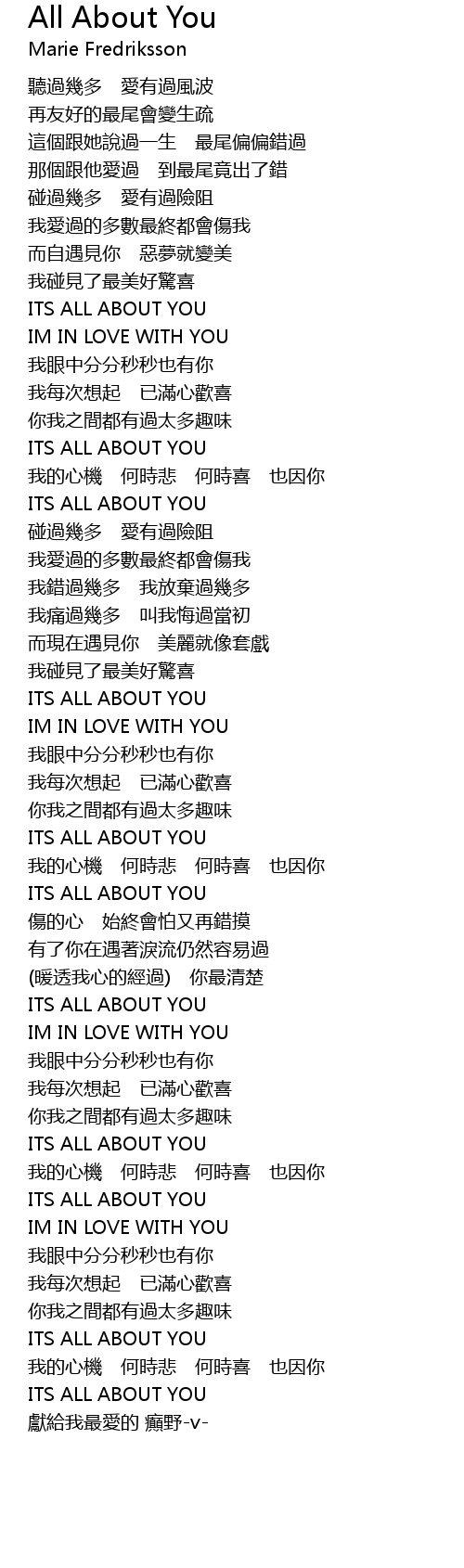 | [01:34.00] | ITS ALL ABOUT YOU |