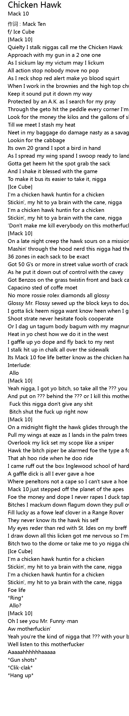 | Quielty I stalk niggas call me the Chicken Hawk | |