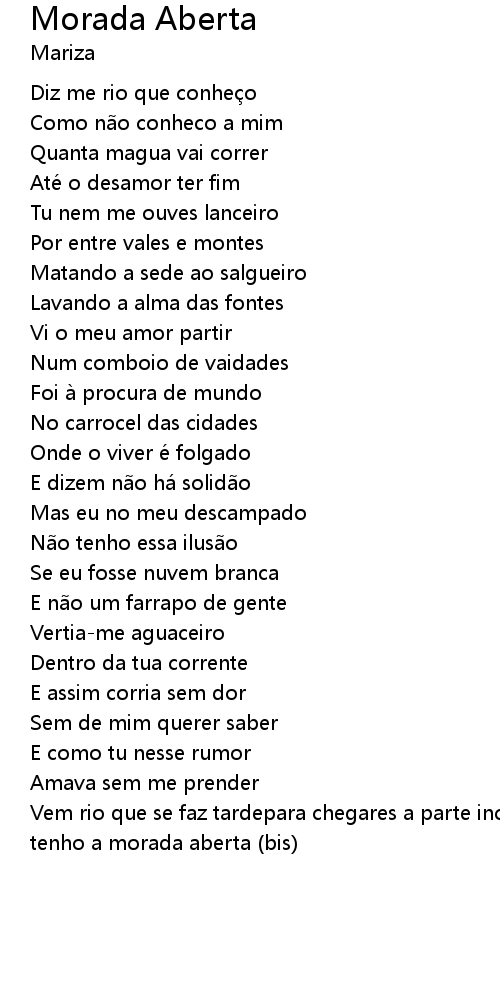 | Vem rio que se faz tardepara chegares a parte incertaespalha por esses montesque tenho a morada aberta (bis) |