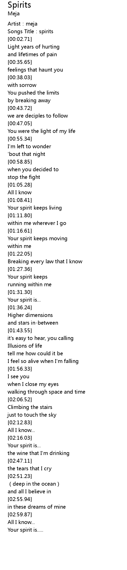 | [00:01.65] | Songs Title: spirits |