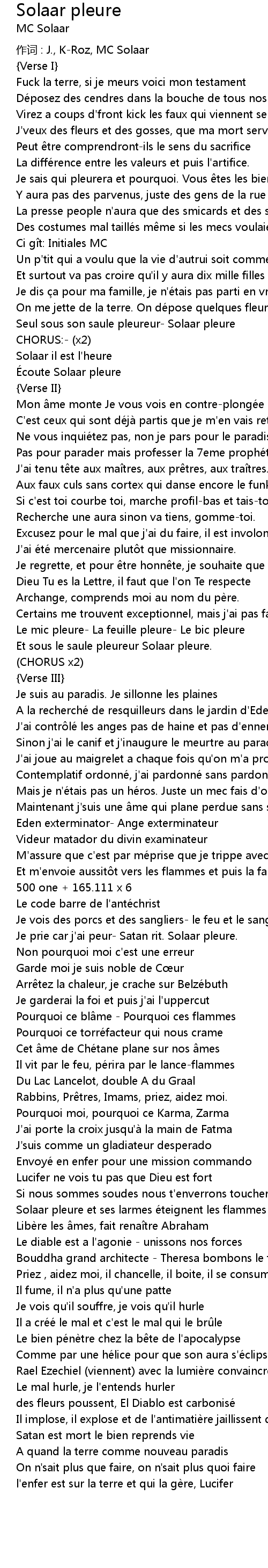 | Je prie car j' ai peur Satan rit. Solaar pleure. | |