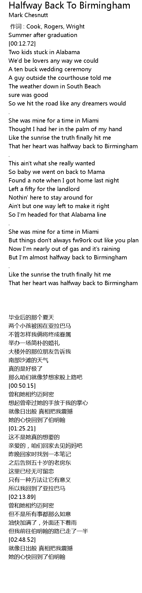 | [01:19.21] | That her heart was halfway back to Birmingham |