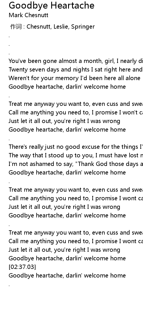 | [02:34.40] | Goodbye heartache, darlin' welcome home |
