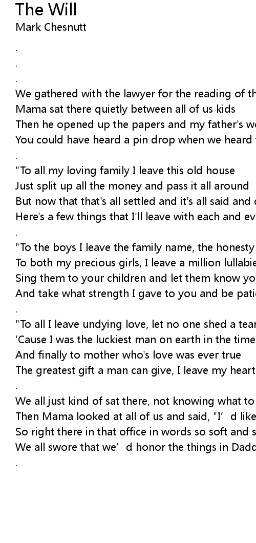 | [02:59.57] | We all swore that we’d honor the things in Daddy’s will |