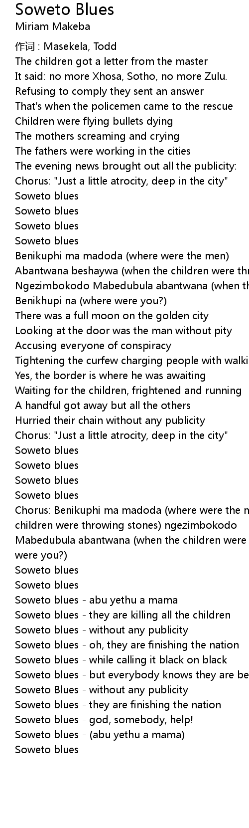 | Chorus: Benikuphi ma madoda where were the men abantwana beshaywa when the children were throwing stones ngezimbokodo | |