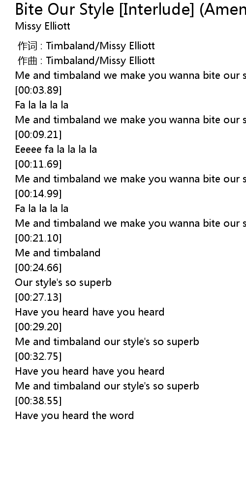| [00:06.52] | Me and timbaland we make you wanna bite our style |