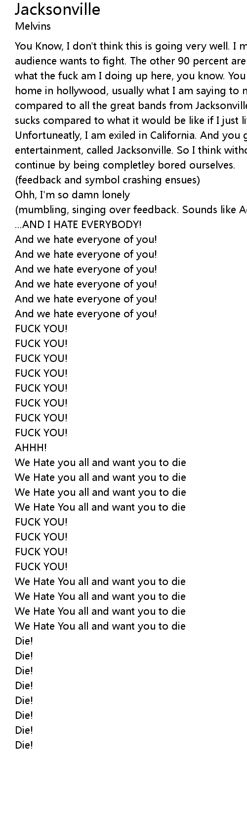 You Know, I don't think this is going very well. I mean, like 10 percent of the audience wants to fight. The other 90 percent are totally bored. So its like, what the fuck am I doing up here, you know. You know when I am sitting around at home in hollywood, usually what I am saying to myself is how much we suck compared to all the great bands from Jacksonville. I'm thinking how much my life sucks compared to what it would be like if I just lived in Jacksonville. Unfortuneatly, I am exiled in California. And you guys are in this hot bed of entertainment, called Jacksonville. So I think without any further ado, we will continue by being completley bored ourselves. |