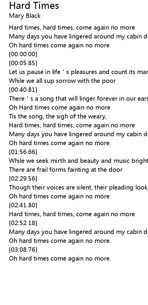| [02:43.62] | Hard times, hard times, come again no more |