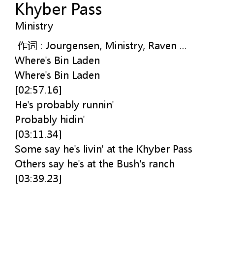 | [03:14.55] | Some say he's livin' at the Khyber Pass |