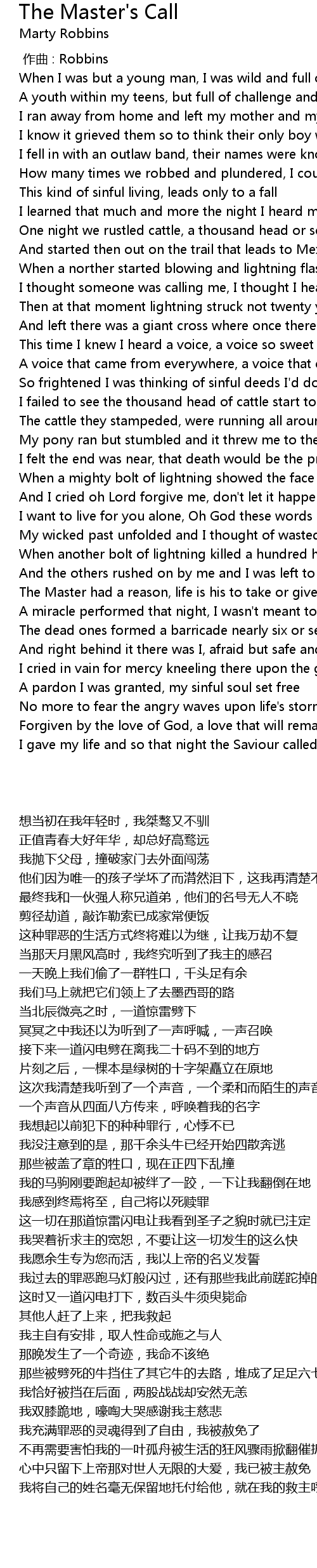 | [00:38.258] | I learned that much and more the night I heard my Master' s call |