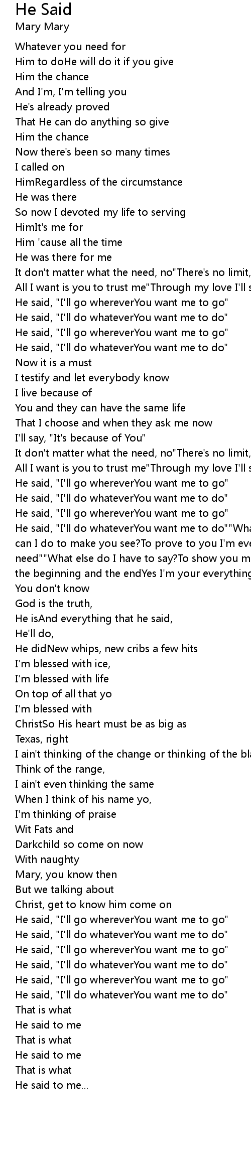 | He said, "I'll do whateverYou want me to do""Whatever you want from meWhat else can I do to make you see?To prove to you I'm everythingThat you'll ever need""What else do I have to say?To show you more clearlyThat I am, that I am the beginning and the endYes I'm your everything" | |