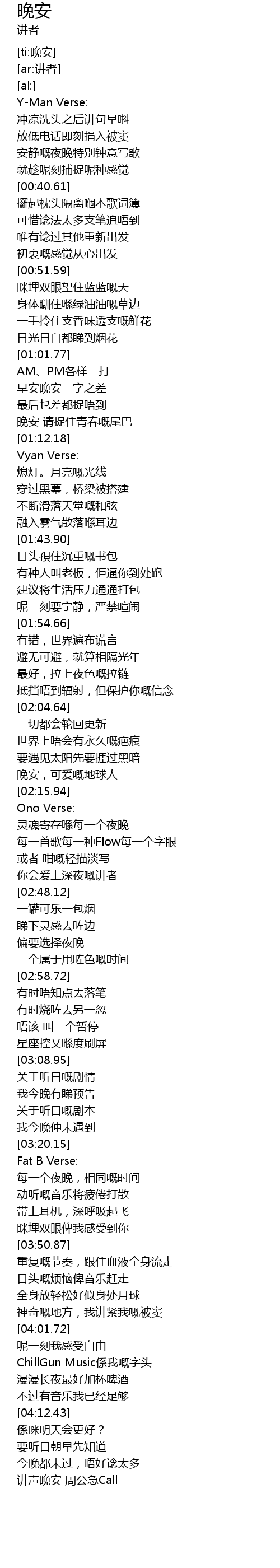 | [04:20.47] | jiǎng shēng wǎn ān zhōu gōng jí Call |