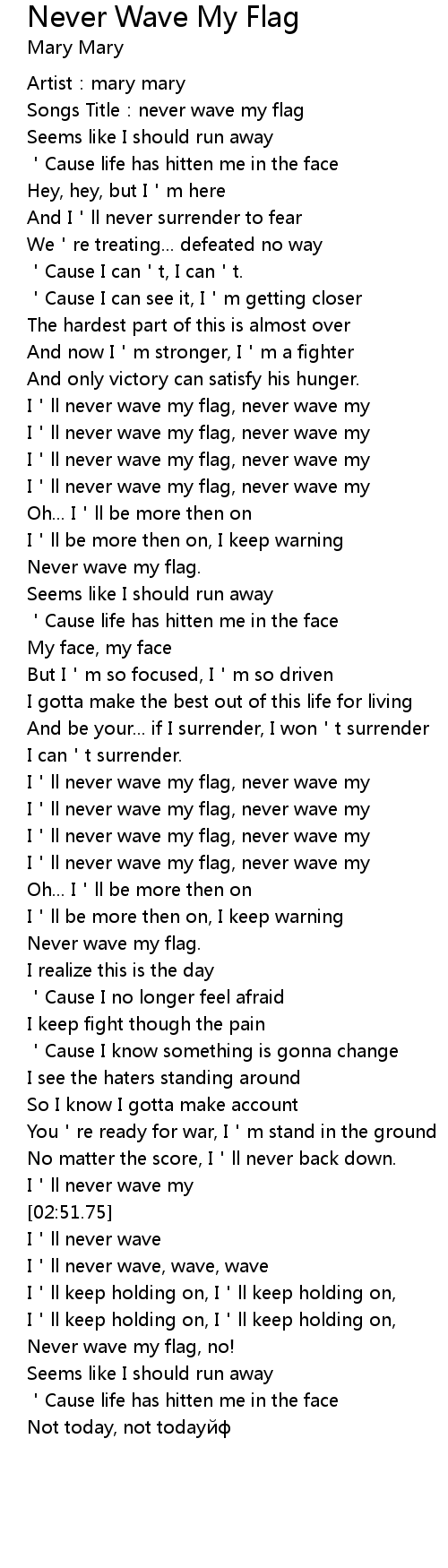| [02:02.82] | I ll never wave my flag, never wave my |