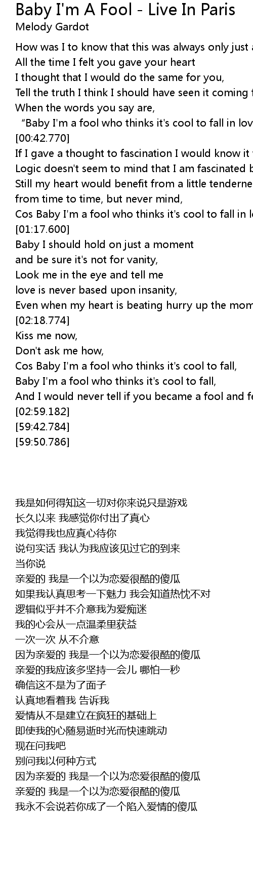 | [00:35.600] | " Baby I' m a fool who thinks it' s cool to fall in love" |