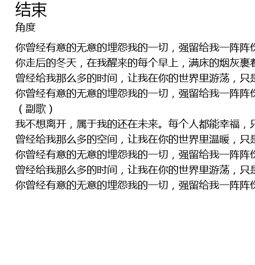 | [02:15.05] | 我不想离开,属于我的还在未来。每个人都能幸福,只是害怕结束。失去没有关系,让你埋怨有点委屈,你留下的遗憾明天就过去。 |