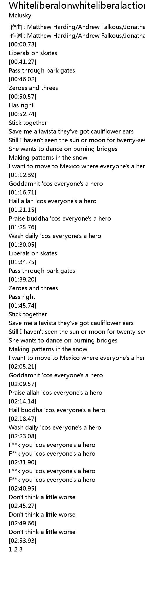 | [02:05.81] | Goddamnit ' cos everyone' s a hero |
