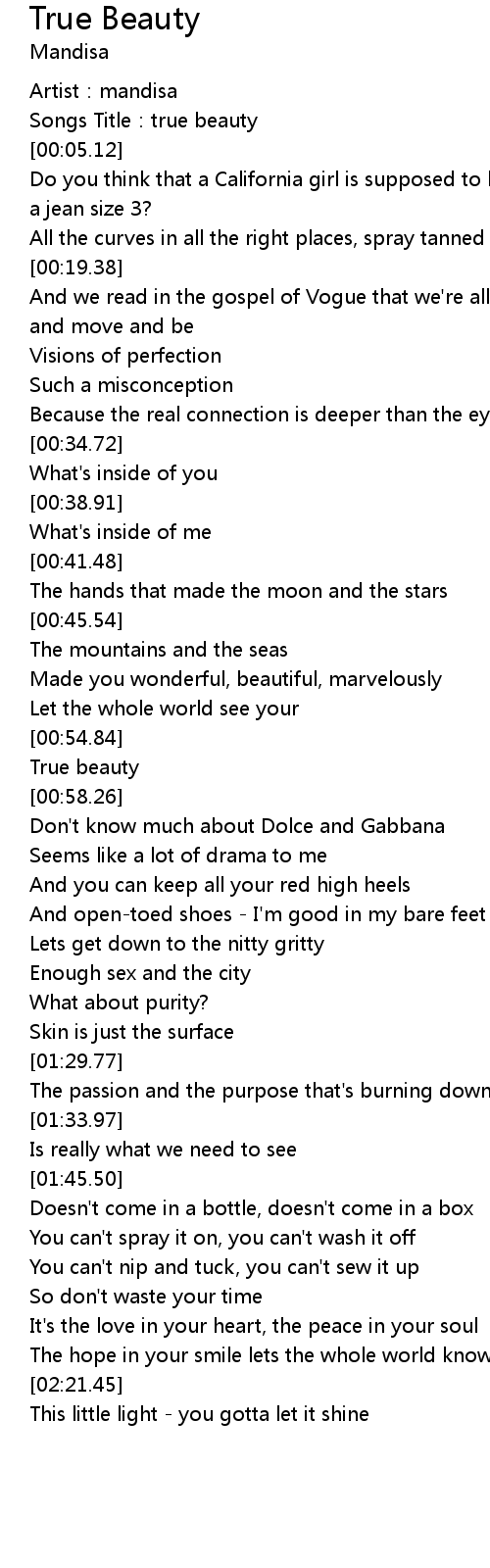 | [00:10.99] | Do you think that a California girl is supposed to have curls and wear a jean size 3? |