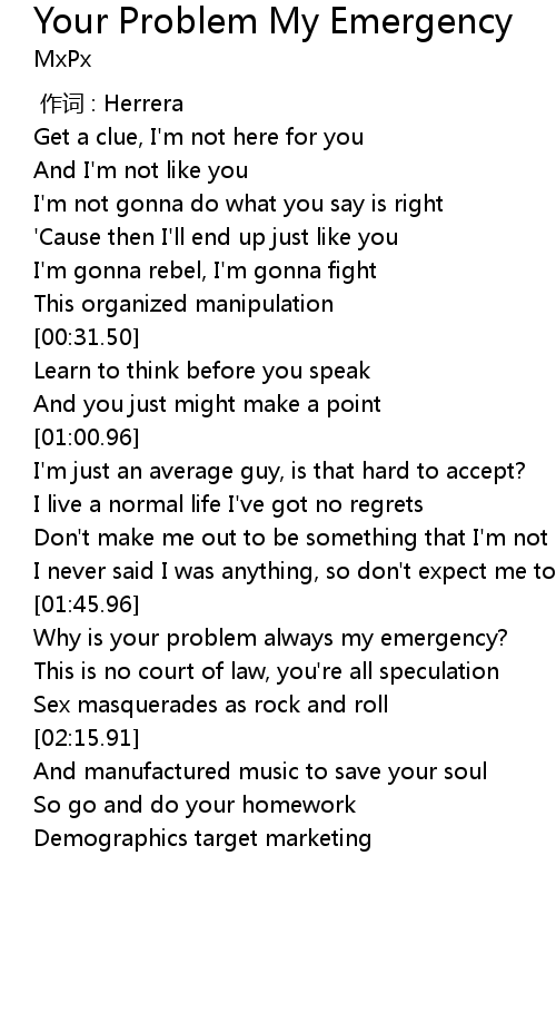 | [02:03.24] | Why is your problem always my emergency? |